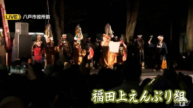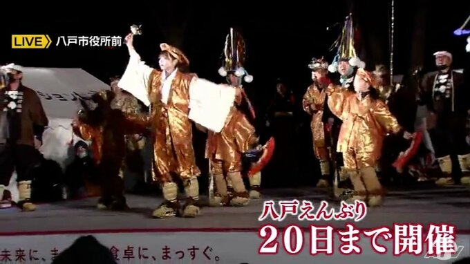 えんぶり組、そして観客ともに開催を喜んでいる「八戸えんぶり」。いま、八戸市役所前で行われているかがり火えんぶりを中継で紹介します。