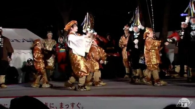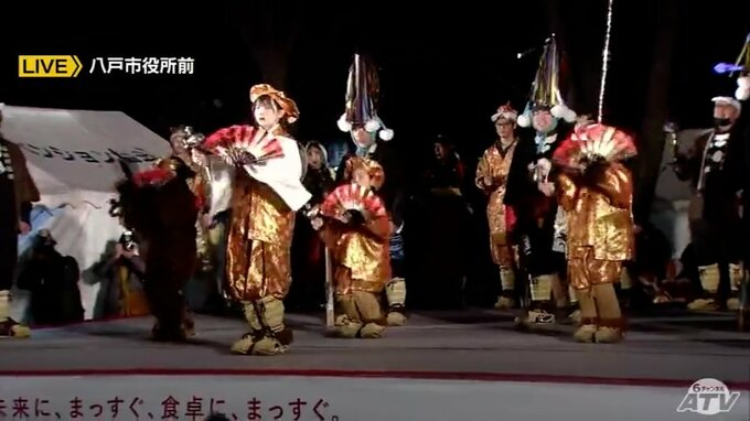 澄んだ夜空の下燃え上がるかがり火、その明かりのなか、こどもたちによる大黒舞が披露されています。八戸市役所前の広場で午後6時に始まったかがり火えんぶり、いま、舞台に上がっているのは福田上(ふくだかみ)えんぶり組です。新型コロナの影響で3年ぶりとなる八戸えんぶり。メンバー約30人のうち小学生3人はきょうが初めての舞台となります。