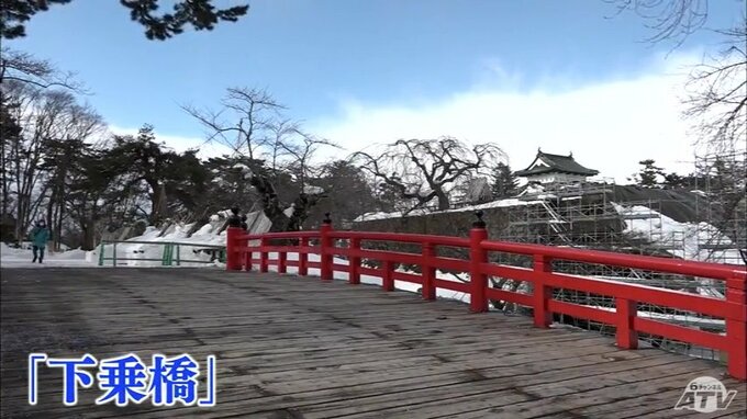 「下乗橋」は、四季折々の景色が楽しめる公園内でも屈指の人気を誇る撮影スポットとして知られていて、弘前さくらまつりの期間中は満開の桜を撮影しようと、多くの人たちでにぎわいをみせます。きょうも雪景色を背景にした弘前城を撮影する人が訪れましたが、工事が終わるまでは通行止めになります。