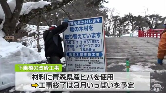 今回の橋の架け替えでは前回の改修と同じく材料に耐久性が高い青森ヒバを使用。工事の終了は3月いっぱいを予定しています。