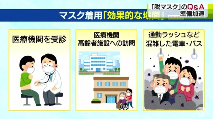 厚生労働省は▽医療機関の受診をする時や▽重症化リスクの高い人が多い医療機関・施設などを訪問する時▽混雑した電車やバスに乗車する時この3つの場面ではマスクが効果的だとしています。