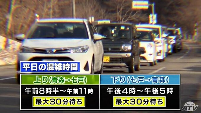道路を管理する県道路公社によりますと平日の混雑する時間帯は七戸へ向かう上りが午前8時半から11時、青森へ向かう下りが午後4時から5時でともに最大30分待ちです。土日では上りが午前10時から正午で最大30分ですが、下りは午後4時から5時に最大1時間となります。