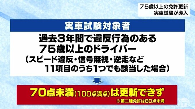 対象となるのは、過去3年間にスピード違反信号無視、逆走など違反行為11種類のうち1つでもあった75歳以上の人で、実車試験を受けて、100点満点のうち70点未満ならば免許を更新できません。