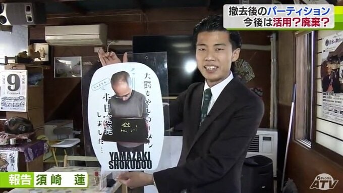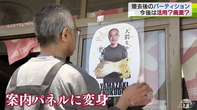 パーティションは、大きさが半分ほどになって山崎さんの顔とコメントが印刷され、店の外からラーメンの販売状況が一目でわかる案内パネルとなりました。