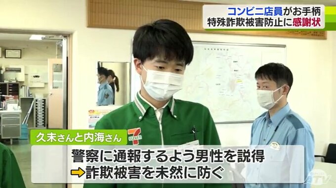 すでに前年越えの特殊詐欺被害 被害未然防止で青森県警に表彰されたコンビニ店員「積極的に声掛けしていきたい」 2023年6月6日(火) 19:38 国内 青森県内で急増している特殊詐欺の被害を未然に防いだとして弘前市のコンビニエンスストアの店員に感謝状が贈られました。感謝状が贈られたのは「セブン‐イレブン弘前取上2丁目店」の店員・久末和輝さんと内海史…