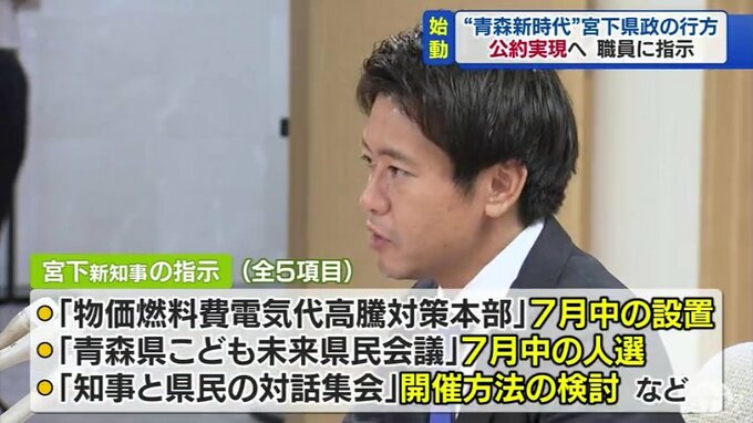 この庁議だけでも出した指示は5つ。「物価燃料費電気代高騰対策本部」の7月中の設置や、女性を中心とした「青森県こども未来県民会議」のメンバーの人選、知事と県民が対話できる集会の開催方法の検討などでさっそく、公約の実現に向けて動き出しました。