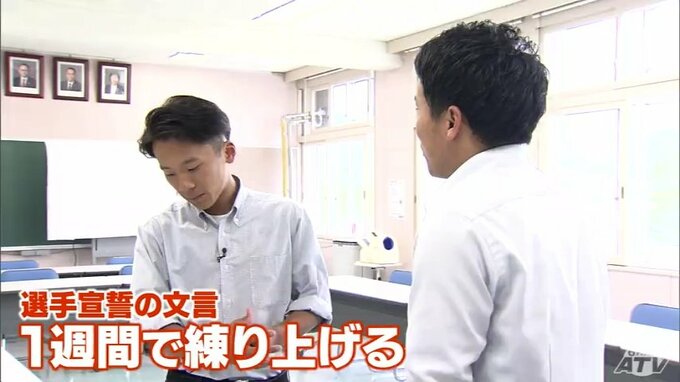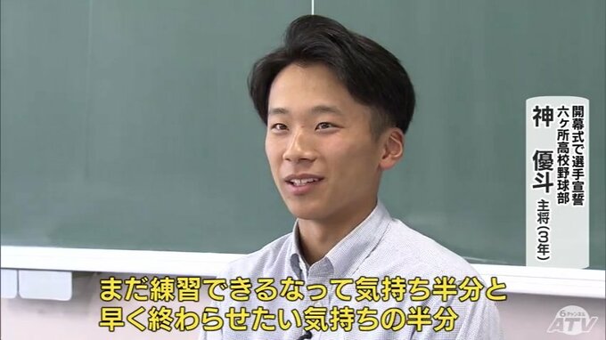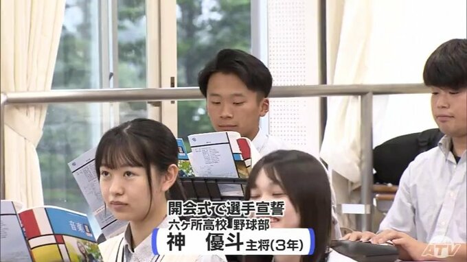 「六ヶ所高校にやってきました。いました、開会式で選手宣誓をするキャプテンの神優斗選手です」