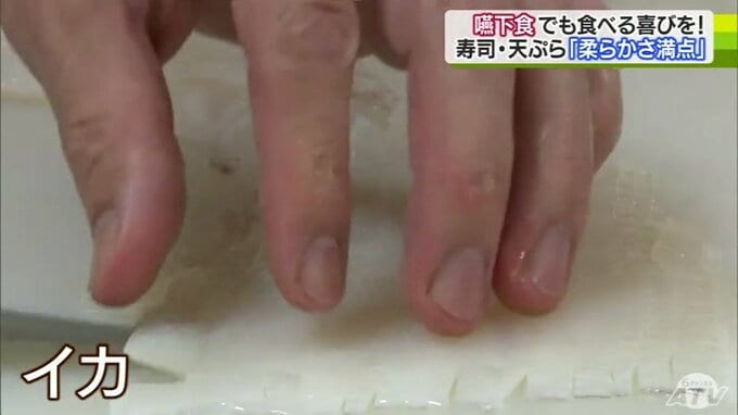 丁寧にさばかれるイカ。ここに、さらにひと手間かけイカをミキサーに。細かくなったイカをリング状にしてから、からりと揚げるとイカの天ぷらが完成です。柔らかく味や見た目にもこだわった嚥下食が八戸市の高齢者施設で提供され、入所者に食べる喜びを届けました。