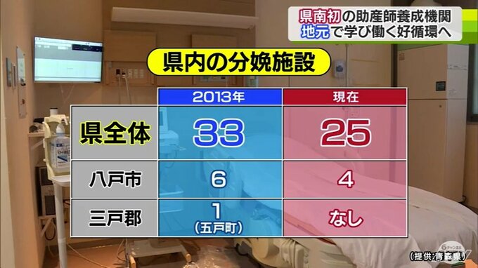 大きな課題となったのは、各医療機関からは助産師の養成が求められている一方で、子供を産むことできる場所は減り続けていることです。青森県全体の分娩施設は10年前、33か所ありましたが、現在は25か所になりました。このうち、八戸市は6か所から4か所になり、三戸郡は唯一の分娩施設だった五戸町の病院が現在は休止していました。