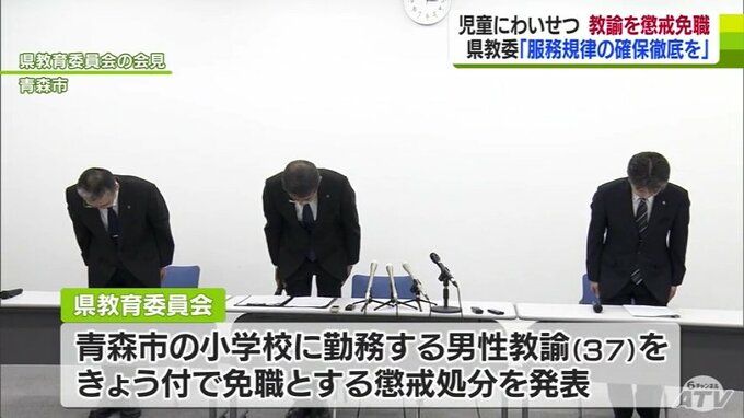 「気の緩みあったかもしれない」女子トイレで児童にわいせつ 男性教諭(37)を懲戒免職 2023年7月28日(金) 17:18 国内 青森県教育委員会は、青森市の小学校の女子トイレで、女子児童にわいせつな行為をしたとして逮捕された37歳の男性教諭を懲戒免職処分にしました。県教育委員会は28日午後、会見を開き、青森市の小学校に勤務する37…