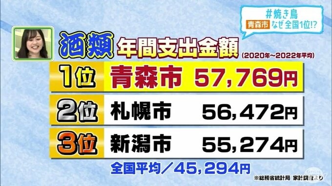 実は青森市だけでも持ち帰りができる焼き鳥店が、約20店舗もあるんです。近所に焼き鳥店が多いことで、気軽に買える機会が多い。そういうことも支出金額1位の理由かもしれません。