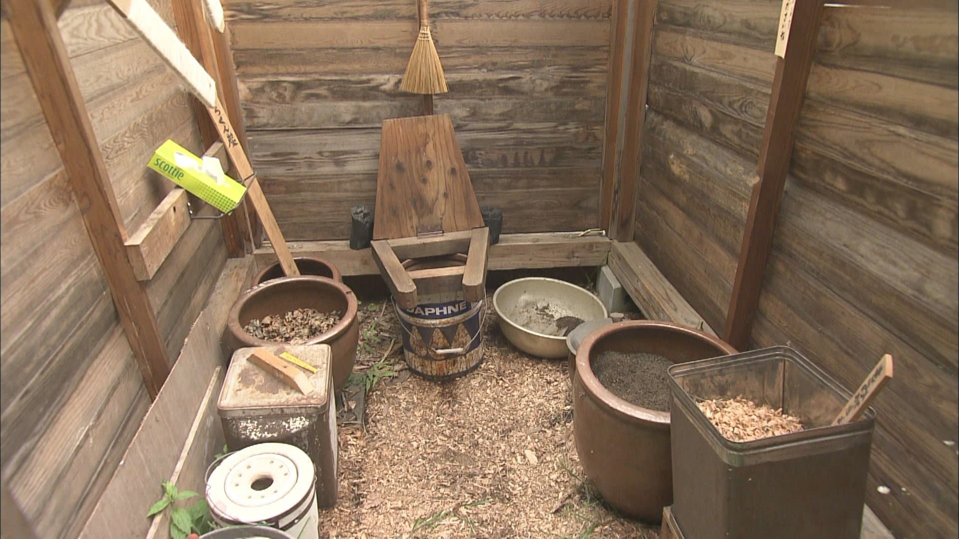 家屋の裏にあるのが、余一さん自慢の手作りトイレです。便器は、オイル缶と廃材で作りました。便器には、ちょっとした工夫が。ウンチとオシッコは混ざることで悪臭を発生させるため、オイル缶の底に排水用の穴が、側面に通気穴があけられていて、なるべくドライ状態を保つようにしてあります。用を足した後は、トイレに置いてある燻炭やおがくずをかければOK。トイレットペーパーの代わりは、外に生えてある葉っぱ。田村さんちのトイレは地球にもお尻にも優しいトイレなのです。