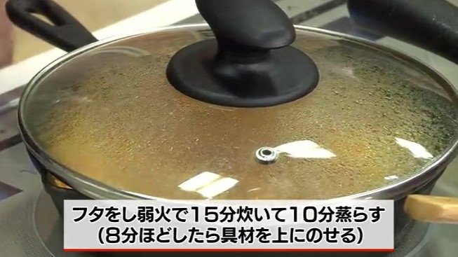 6.フタをして弱火で8分ほど炊いたら、取り出して置いた具材を上にのせ再び7分ほど炊く。合計15分炊いたらフタをしたまま10分置いてしっかり蒸らす。