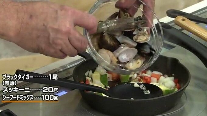 3.香りが出たら、解凍したシーフードミックス、ブラックタイガー、ズッキーニを加えて炒め、白ワインを加えてアルコールを飛ばす。