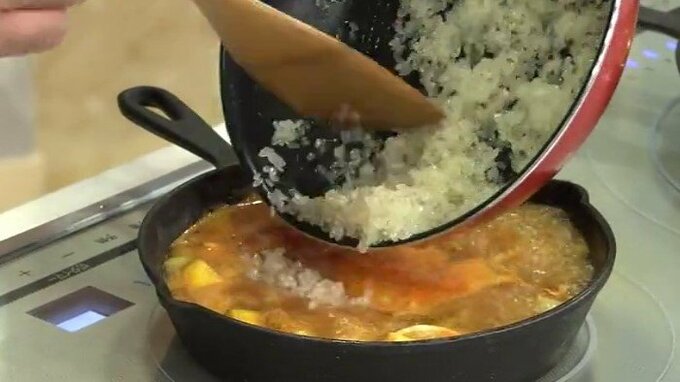 2.スキレットや小さめのフライパンにオリーブオイルを入れて熱し、玉ねぎとパプリカを炒める。全体に油が回ったらニンニクを加える。