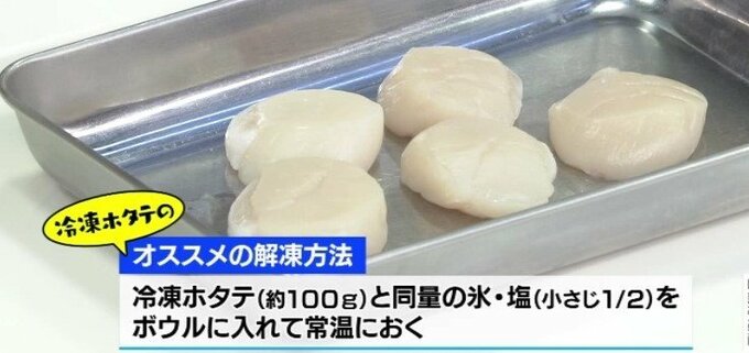 ※冷凍ホタテのオススメ解凍方法…冷凍ホタテ(約100g)と同量の氷と塩小さじ2分の1をボウルに入れ約3時間ほど常温に置く。