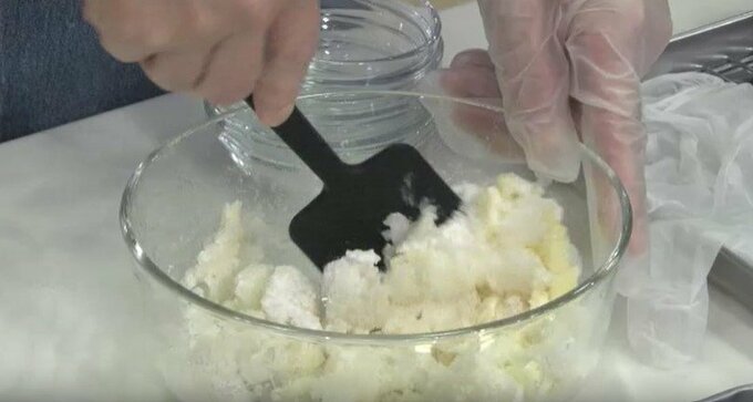 3.2の粗熱が取れたら、片栗粉、粉チーズ、角切りにしたプロセスチーズ、コンソメ顆粒を加えてよく混ぜ、一口大に丸める。