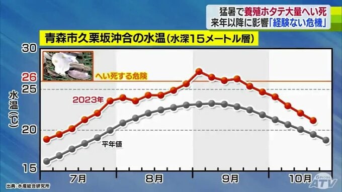 ホタテがへい死した原因は記録的な猛暑による海水温の上昇です。青森市沖合いの水温は2023年、平年値を大きく上回り、9月にホタテがへい死する危険がある26℃を上回っていました。