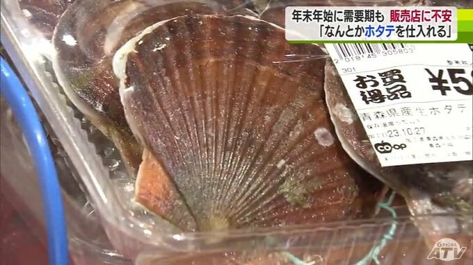 ホタテの活貝はこれからお歳暮や年末年始の需要期を迎えるため、店は商品を確保できるか不安を抱えています。