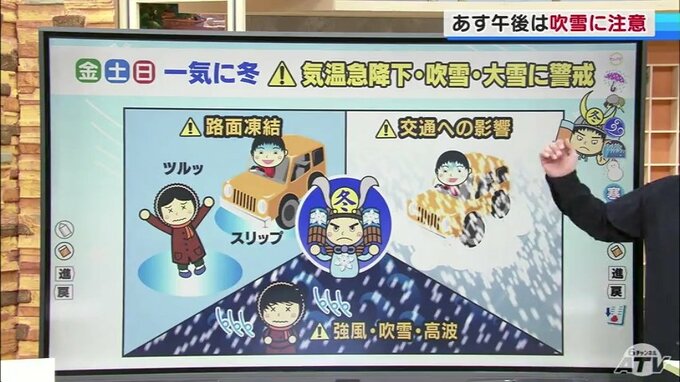 24日のお昼頃にかけては標高の高い山の方から気温が下がりますから、雨から雪へと変わってくるという状況。平地の方では24日の午前中はまだ雨です。ただ横殴りの雨です。その後、今季一番の寒気が入ってきまして平地の方でも気温が下がっていき、そして風を伴って吹雪くところが出てきます。夜は気温が下がって、平地でも雪の積もるところが出てきそうです。この一連の寒波は少なくとも24~26日の金土日の期間、青森県に影響しそうです。気温の急降下、吹雪・大雪に警戒です。