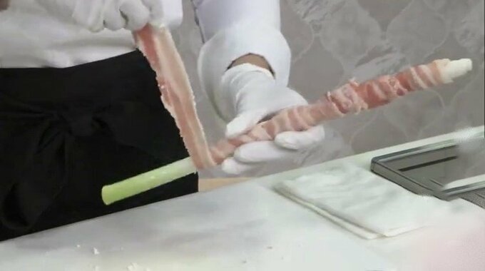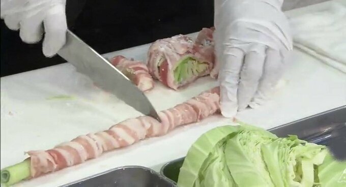 3.長ネギ・エリンギ・キャベツそれぞれに1の豚バラ肉を巻き付ける。(具材の大きさにより1~3枚の豚バラで巻く)