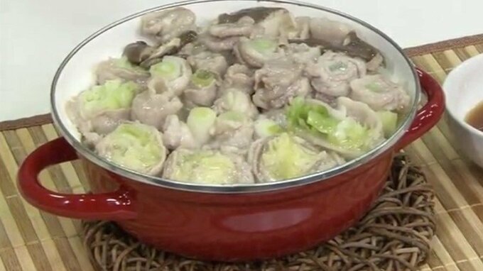 「肉巻き鍋」 野菜やきのこを豚バラで巻いて投入するワイルドなお鍋です。