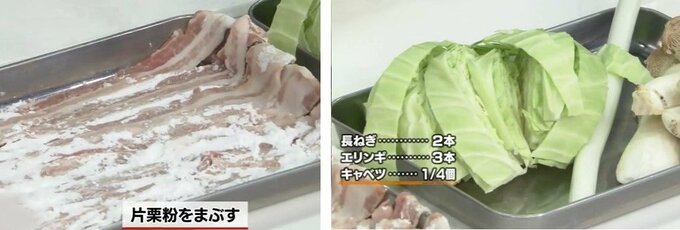 1.豚バラスライスは広げて片栗粉をまぶす。