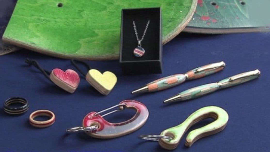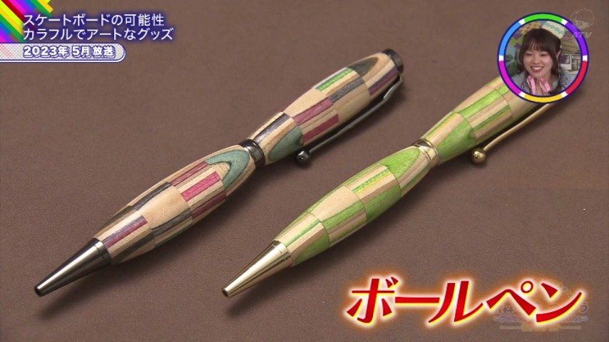 出来上がったのは、なんとボールペン。穴久保さんの職人の技が活かされた珠玉の一品です。スケボーの廃材で作られる商品は、ボールペンだけではなく、かわいらしいフォルムで愛される小物に、アップサイクルされています。