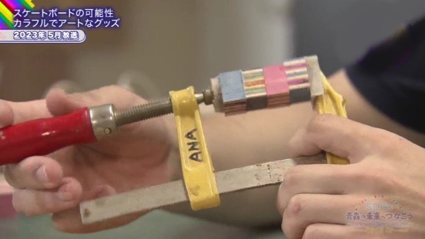 細かく裁断したスケボーを接着剤で合わせ、ブロック状に組み立ててカット。組み合わせると、何やらカラフルなブロックが。ブロックに穴をあけて削り、丸みをつけていきます。何を作っているのかわかりましたか。