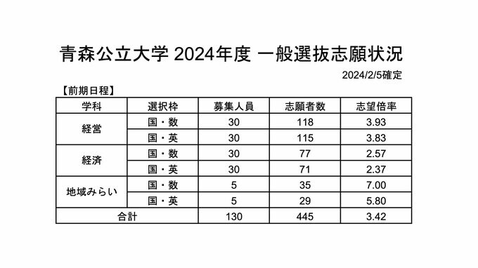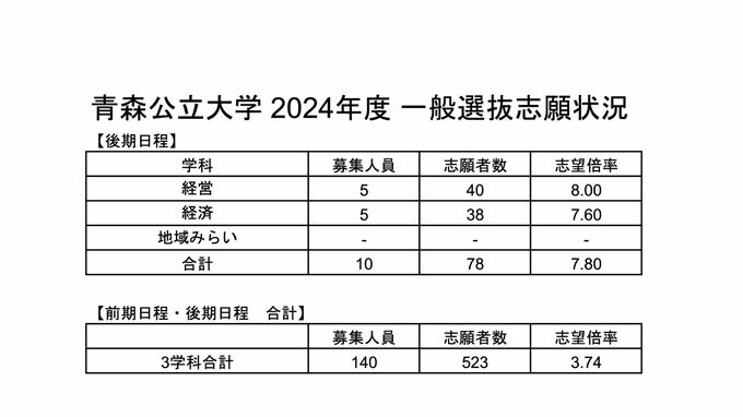 青森公立大学(青森市)は6日、2024年度の一般選抜志願状況を発表した。