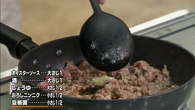 3.合いびき肉に火が入ってきたら、調味料を加えて汁気がなくなるまで炒める。