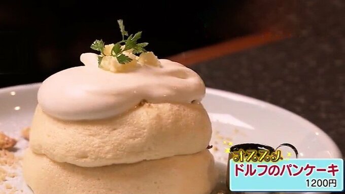 メレンゲをたっぷり使用して作る「ドルフのパンケーキ」(1,200円)もおすすめ。ふわふわのスフレ生地に程よい甘さの生クリーム、クッキークランブルとの食感の違いも楽しめそうです。
