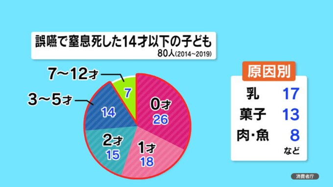消費者庁によりますと、食べ物などが気管に入る誤嚥で亡くなった14歳以下の子どもの数は、2019年までの6年間で80人にのぼります。