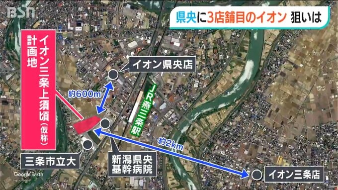 新たなイオンの計画地から直線距離でわずか600m先には燕市の「イオン県央店」が、またおよそ2km先には「イオン三条店」の2店舗がすでにあるのです。