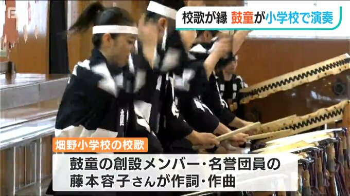 実はこの小学校の校歌は鼓童の創設メンバーで名誉団員の藤本容子さんが作詞・作曲しました。公演はその縁によるもので去年に続き2回目です。