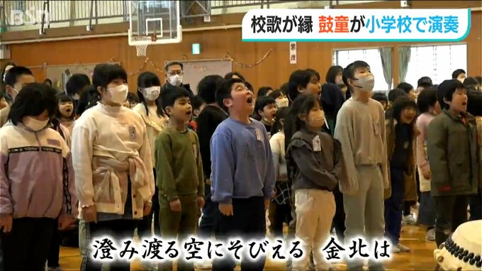 児童は鼓童のメンバーと思いが詰まった校歌を力いっぱい歌いました。