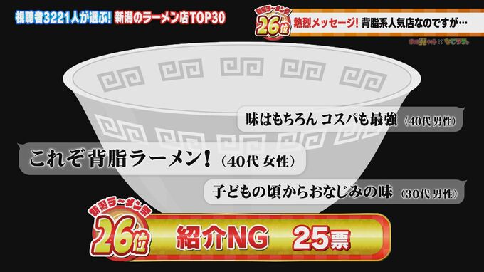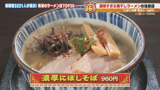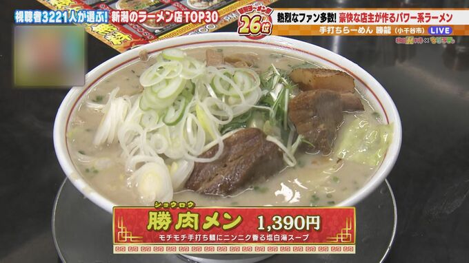 同数26位、4店舗目は小千谷市の「手打ちらーめん 勝龍」。豪快な店主が作るガッツリ系のラーメンはもっちもちの手打ち麺がよく合います。「月1回、家族で通っている」「おいしくて、活気があって元気がもらえます」などと視聴者からコメントが寄せられました。勝肉(ショウロウ)メンは、豚骨のクリーミーさと鶏ガラのうまみが加わったスープに、濃厚な塩ゴマのタレを合わせた大満足の一杯となっています。