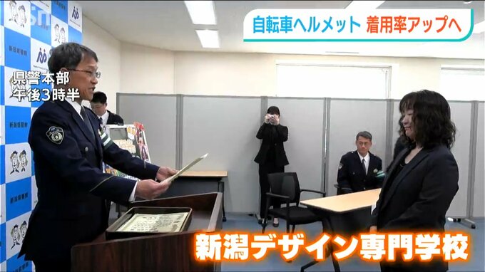 去年、全国で最も低かった自転車のヘルメット着用率を上げようと新潟市の専門学校の生徒がアニメや漫画を意識したポスターを作り、県警から感謝状が贈られました