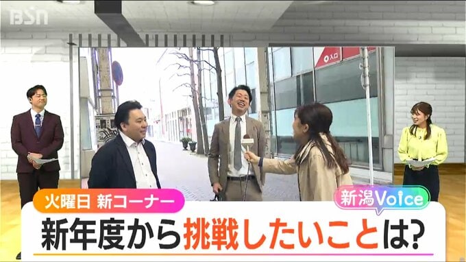 「子どもが歩けるようになってきたので 外で歩かせたいな…」みなさんの“声”をお届けする【新潟voice】新年度に“挑戦したい”ことは? 2024年4月3日(水) 00:52 国内 暮らし・マネー 第1回目の今回は、「新年度から挑戦したいこと」をテーマに、BSNテレビの新キャスター2人が街に飛び出していきました。みなさんは新たにどんなことにチャレンジするのでしょうか?まずは、ベンチでくつろいでいた2…