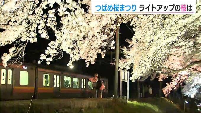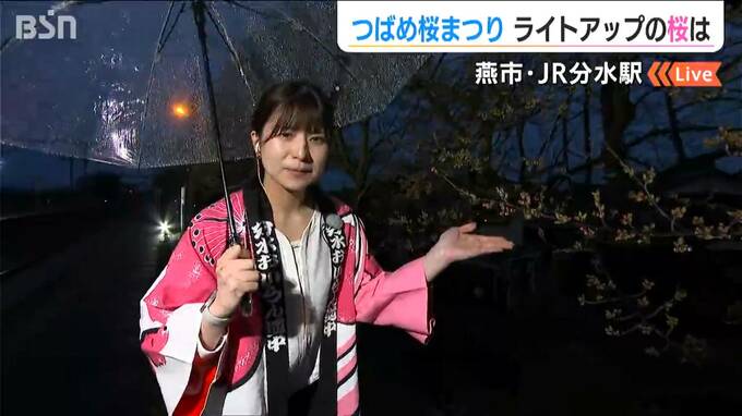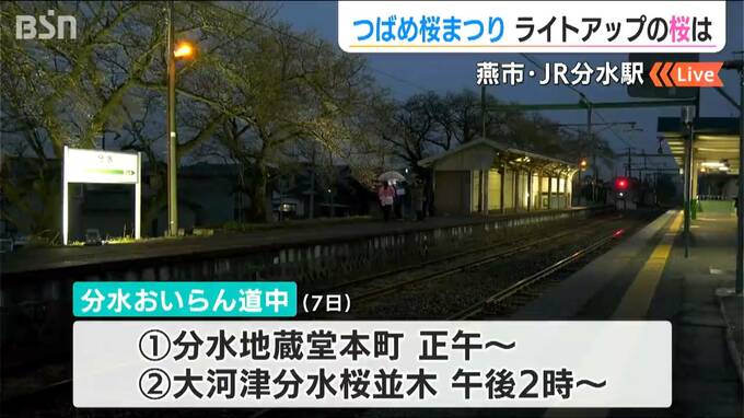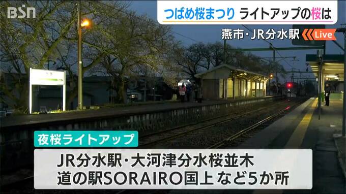 この分水駅周辺には樹齢100年以上の桜が20本ほど並んでいて、桜まつりの期間中は、JR分水駅をはじめ大河津分水の桜並木など、燕市内の“桜の名所”5か所がライトアップされます。