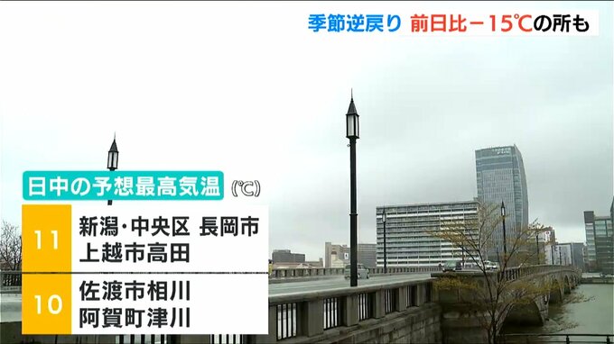 9日の新潟県内は気温が上がらない見通しで、日中の予想最高気温は新潟市中央区と長岡市、上越市高田で11℃となっています。前日8日より15℃以上低くなるところもあり、季節は逆戻りしそうです。