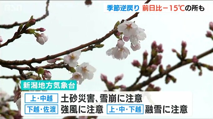 また、前線を伴った低気圧が関東地方を北東へ進み、夜は寒気の影響を受ける見込みで標高の高い所では雪が混じるとみられています。雨も続くとみられ、新潟地方気象台は上・中越では土砂災害やなだれに、下越、佐渡では強風に、上・中・下越では融雪に注意するよう呼び掛けています。