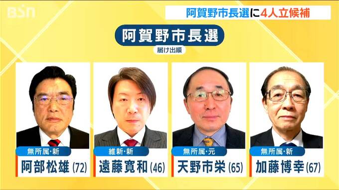 阿賀野市長選挙に立候補したのは届け出順に無所属で新人の阿部松雄氏(72)、日本維新の会で新人の遠藤寛和氏(46)、無所属で元阿賀野市長の天野市栄氏(65)、無所属で新人の加藤博幸氏(67)の4人です。