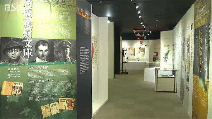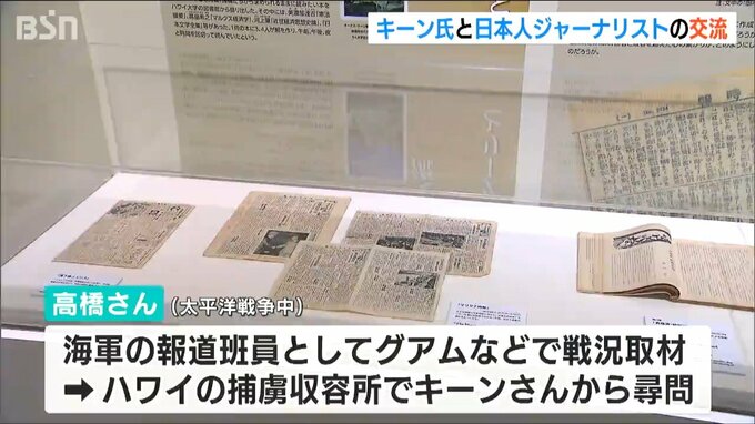 高橋さんは太平洋戦争中、海軍の報道班員としてグアムなどで戦況を取材していてアメリカ兵に捕まり、ハワイの捕虜収容所でキーンさんから尋問を受けました。展示室には、高橋さんが収容所でアメリカ側から書かされた新聞記事やキーンさんが高橋さんの小説を読んで書いた手紙など、およそ180点が展示されています。