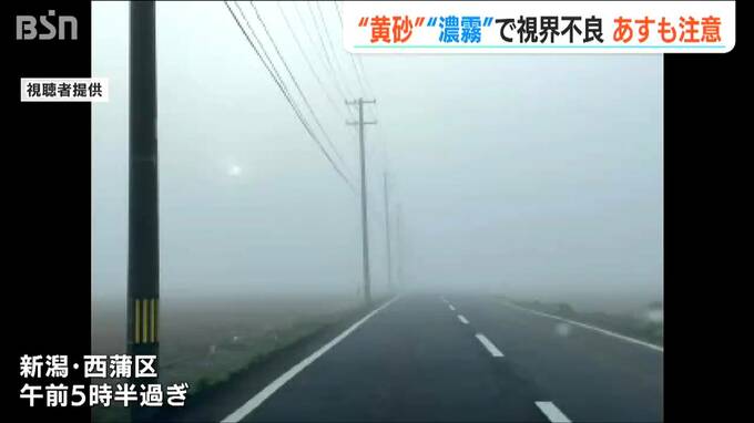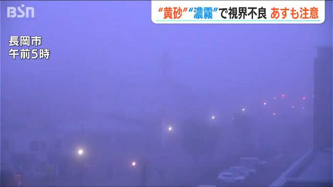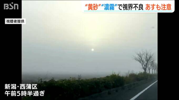 日の出からまもない午前5時ころの新潟市のシンボル・萬代橋(中央区)周辺では、“今年最大”と全国的に注意が呼び掛けられていた「黄砂」に加え、地表からの水蒸気による濃い霧も発生し、視界は1km未満になりました。