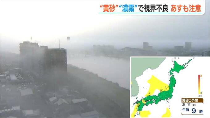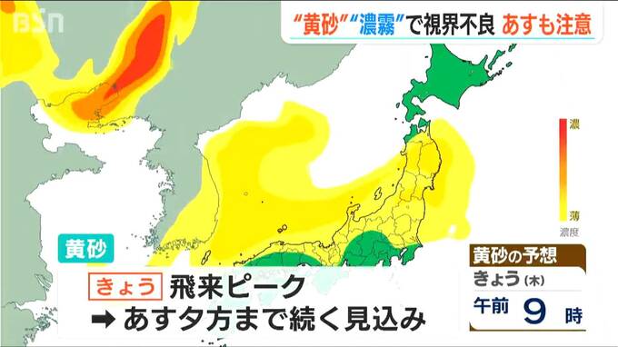 「黄砂と濃霧」かすむ新潟 19日にも黄砂は続くので運転などにはご注意ください 2024年4月18日(木) 19:53 国内 黄砂は、17日午前9時ごろから新潟県内にも飛来していました。 黄砂の飛来は18日がピークとみられ徐々に弱まる見込みですが、19日にも飛来は続き見通しが悪くなる恐れがありますので、車の運転などには十分ご注意ください。
