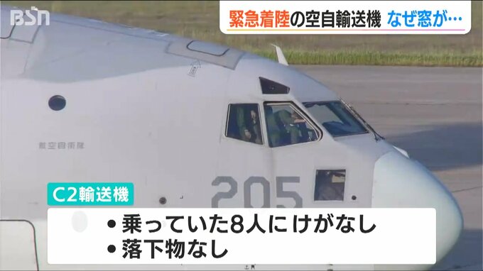事故に備え消防車両が駆け付けましたが無事着陸したため放水活動などは行わず、輸送機に乗っていた8人にけがはありませんでした。落下物などもなかったということです。