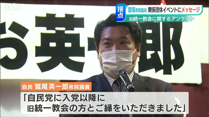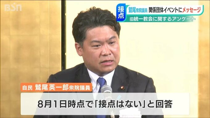 BSN新潟放送の8日「ゆうなび」で新潟県関係の国会議員と旧統一教会との接点に関するアンケート調査の結果をお伝えしました。そのうち、接点はないと回答していた鷲尾英一郎衆議院議員が関係団体のイベントにメッセージを送っていたことが分かりました。