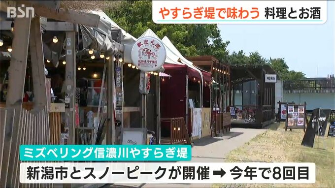 新潟市 中央区のやすらぎ堤に飲食店が出店する夏の恒例イベントが始まりました。水辺ででき立ての料理とおいしいお酒が楽しめます。