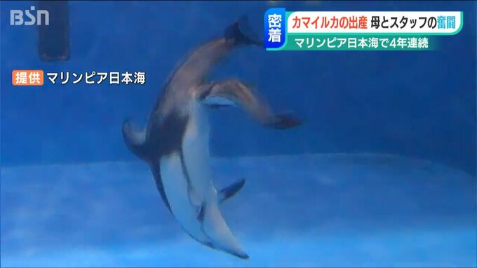 カマイルカの出産は、破水からおよそ2~3時間後。早朝、15人のスタッフが駆けつけました。